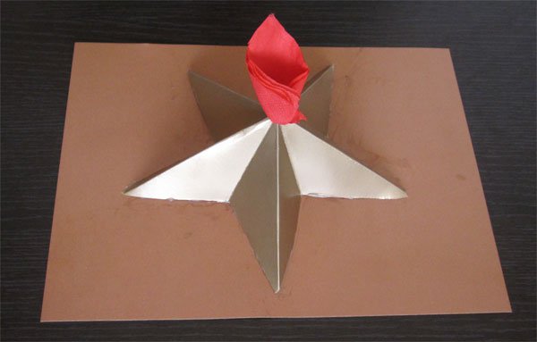 Предлагаем к 9 Мая в качестве поделки сделать вот такую аппликацию из бумаги. Для нашей открытки к 9 маю понадобится: лист А4, цветная бумага(зеленая, оранжевая, черная),бумажные салфетки красного цвета, ножницы,клей. Как сделать: 1.Делаем заготовки для цветка и для