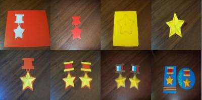 Для создания ордена победы нам понадобится: карандаш; клей; линейка; ножницы; цветная бумага желтого цвета; цветной картон красного цвета. orden Алгоритм создания такого ордена выполняется пошагово с подробным фото-инструктажем: На бумаге нарисуйте шаблон необходимой формы и размера, а затем переведите его на красный картон и вырежьте. На желтой бумаге нарисуйте пятиконечную звезду с пунктирными линиями для сгиба и внутренними сторонами для приклеивания. Такую звезду необходимо вырезать и сложить по пунктирным линиям и боковым сгибам для придания объема фигуре. Аккуратно приклеиваем на основу из картона желтую звезду. На верхнюю часть ордена можно приклеить полоски из желтой бумаги или в цветах флага, а также использовать такой орден отдельно или для композиций, панно или открыток.