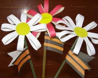 Самыми дорогими подарками для бабушек, дедушек и ветеранов становятся поделки к 9 Мая, которые с любовью делают дети. К тому же время совместного творчества – это хороший повод рассказать детям про войну, почему так важно ценить, уважать и помогать ветеранам и никогда не забывать об их подвиге. Аппликацию можно сделать из цветной бумаги. Сначала надо нарезать из бумаги 16 белых и 8 красных полосок одинаковой длины, свернуть каждую полоску пополам и склеить каждые 8 полосок так, чтобы все концы полосок сходились в одной точке, образуя при этом лепестки ромашки. На лепестки наклеить желтую сердцевину. Стебельки ромашек вырезать из зеленой бумаги. Листочки сделать в виде флажков зеленого цвета с наклеенными желтыми полосками. Листочки-флажки обвернуть вокруг стебелька, и все это – стебельки и цветочки – наклеить на фон – лист плотной черной бумаги. Аппликация готова. Если стебелек сделать из тонкой веточки или проволоки для флористов, то ромашки можно нести в руке, а не приклеивать в виде аппликации. Также для листиков вместо бумаги можно использовать ткань. Приклеить ткань к ткани можно с помощью горячего утюга. Сделать это можно так. Положить на стол несколько листов газеты. На газету положить фон – ткань или плотную бумагу. На ткань ложится кусок целлофана, на него – детали аппликации, а затем – чистую белую бумагу. Все это прогладить горячим утюгом. Затем убрать лишние кусочки целлофана.