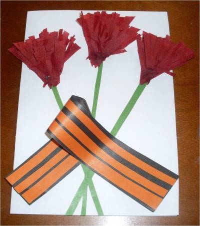 Для нашей открытки к 9 маю понадобится: лист А4, цветная бумага(зеленая, оранжевая, черная),бумажные салфетки красного цвета, ножницы,клей. Как сделать: 1.Делаем заготовки для цветка и для Георгиевской ленты. 2. Начинаем собирать цветок. Клеем отдельно каждую заготовку из салфетки. 3. Каждому цветку приклеиваем стебель. 4. Всё наши цветки готовы. 5. Какое 9 мая без Георгиевской ленты, теперь очередь делать ленту. 6. Приклеиваем ленту к открытке. 7. Вот и все. Наша открытка готова.
