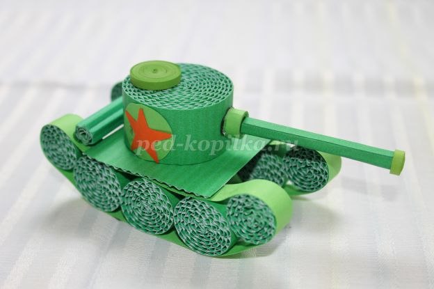 - Цветной гофрированный картон; - Тонированная бумага; - Острые ножницы; - Простой карандаш; - Линейка; - Инструмент для квиллинга; - Клей-карандаш Ход работы: Это рассказ об истории самого великого праздника нашей страны о Дне Победы. Рассказ для детей о празднике 9 мая. Рассказ для школьников о празднике 9 мая, День Победы. Победа русского народа и народов бывшего Советского Союза в Великой Отечественной войне 1941-1945 гг. является трагической и героической вехой в ряду переломных событий XX в. Никогда прежде им не противостоял такой мощный, жестокий, бесчеловечный враг, который уничтожал все прекрасное и хорошее на своем пути. Для того чтобы устоять, советскому руководству пришлось прибегнуть к чрезвычайным мерам, а народу приложить максимум усилий, ценой миллионов жизней. Несколько ученых во главе с С. Вавиловым сумели создать необходимые для военной техники оптические приборы. И. Бардин долго руководил работами по получению новых видов высококачественной стали, которая потом с успехом применялась в танкостроении и других видах оборонной промышленности. Он на гусеницах мчится, Только он не трактор. В бой пойдет - и пригодится Фронтовой характер. И не плавится в огне Крепкая броня. Только бой не на войне – В детской у меня. Сегодня мы научимся делать из гофрированной бумаги танк. Для этого необходимо: 1. Нам потребуется вырезать из гофрированного картона несколько полос. Ширина 2см – 2-3 полосы, ширина 1 см – 10 полос. 2. Скручиваем из этих полос колесики и приклеиваем на клей-карандаш. 3. Должно получиться 6 больших колесиков, 4 колесика поменьше и одно большое. 4. Склеиваем три больших колесика вместе, а по краям приклеиваем маленькие. Затем вырезаем две полосы из цветной бумаги (1 см) и обклеиваем по краю склеенные колеса. Должны получиться две гусеницы для танка. 5. Нам необходимо сделать несколько деталей для ствола и люк из бумаги и картона. Склеиваем детали, как показано на фото. 6. Пока верхняя часть танка сохнет, фиксируем гусеницы картоном. 7. Соединяем нижнюю и верхнюю часть танка. Добавляем красную звезду. Можно сделать из зубочистки и бумаги красный флаг. Какой далекий это день, желанный, долгожданный, Он светом истины пропел победы гимн наш славный! И ветераны в строй идут, как в те года той битвы, Которая ведь навсегда сроднила нас отныне! И благодарность наша Вам, почет и знамя чести, Мы поздравляем Вас, солдат, вы – воины Отчизны! И кланяемся по пояс Вам за мир и совесть жизни, Мы поздравляем вас, солдат, спасибо Вам за битву!