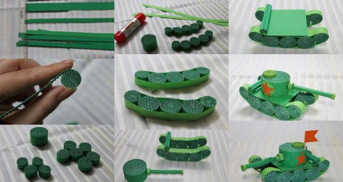 Техника квиллинга представляет собой выполнение фигурок и композиций из них, которые создаются при помощи сворачивания цветной бумаги и картона. Такие фигуры будет легко выполнить и ребенку, а самые младшие могут помогать в создании. Рассмотрим более подробно данную технику на примерах выполнения танка и самолета в военном стиле. Поделка «Танк» на 9 мая Для создания такой фигуры нам понадобится: зеленая бумага; зеленый картон гофрированного типа; карандаш; клей; линейка; ножницы. tank Алгоритм создания танка: Вырезаем из картона 1 полоску в 2 см шириной и 10 полос по 1 см. Из полос картона скручиваем колеса и фиксируем клеем. 5 колес склеиваем между собой и обклеиваем их бумагой для создания гусеницы танка. Повторяем создание второй гусеницы. Из широкой полоски скручиваем люк танка и обклеиваем бумагой. Из картона и бумаги делаем ствол и другие детали танка. Из зубочистки и красной бумаги можно сделать флаг в форме звезды. Склеиваем все детали между собой при помощи квадратного куска картона.