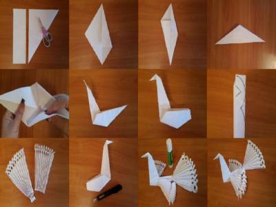 Простые и красивые сувениры, выполненные по технике оригами, в форме голубей станут отличным символом мира и украшением для праздника Победы. Для выполнения таких поделок можно использовать любую цветную или белую бумагу формата А4: На листе бумаги загните угол для образования ровного квадрата. Отрежьте оставшуюся часть от квадрата. Разверните квадрат и загните углы к центру сгиба. Переверните треугольник и снова загните углы к центру. Сложите фигуру пополам. Аккуратно отогните длинную часть с внутренней стороны, придерживая пальцами остальную бумагу. Загните конец длинной части вниз и внутрь для создания клюва птицы. Внутрь спрячьте хвост птицы, который выполняется отдельно. Второй лист А4 для крыльев складываем гармошкой по 1,5 см в ширину. Складываем гармошку пополам и вырезаем на гармошке фигуры как на фото. Для создания хвоста выполняем те же вышеперечисленные действия как для крыльев, но обрезаем с одной стороны 3 см бумаги, чтобы узор остался только на одной стороне гармошки. На туловище птицы делаем надрез для вставки крыльев и просовываем их. Приклеиваем хвост к задней части туловища и боковые части крыльев.