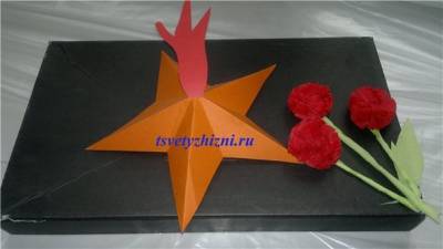 Итак, Вечный огонь — символ неувядающей славы тех, кто сражался за нашу свободу. Наша память об их героизме и подвигах. Наше уважение и благодарность всем павшим в боях, и пережившим эти страшные дни нашей истории… А для поделки нам понадобится: - двусторонняя цветная бумага - столовые салфетки красного и зеленого цветов - зубочистки или шпажки - ножницы - клей - крышка от обувной коробки. Берем крышку от обувной коробки. Обклеиваем ее черной бумагой (можно раскрасить красками, или оставить без изменения, если она черного цвета). Это наш будущий постамент для Вечного огня. А из бумаги красного цвета вырезаем огонь. В центре звезды делаем небольшое отверстие и продеваем туда огонь. Чтобы «огонь» держался с обратной стороны делаем небольшой разрез и приклеиваем его к внутренней стороны звезды. Саму звезду приклеиваем в центр коробки. Делаем гвоздики. Для этого берем столовую салфетку. Как правило, каждая салфетка имеет три слоя. Разделяем ее на три тоненькие салфетки. Берем одну и складываем ее пополам. Потом еще пополам. Получаем квадрат. Если предварительно сложить вместе не одну, а два разделенных слоя салфетки, то на этом этапе уже можно вырезать гвоздику. Она будет более крупной формы. Но мне нужны были гвоздики поменьше. Поэтому складываем салфетку еще дважды. Получается вот такой квадратик, центр которого скрепляем степлером. Вырезаем круг. Немного распушить края. Делаем по кругу надрезы, не дорезая до середины. Распушить края и немного приподнять к центру. Все гвоздика готова. Зубочистки или маленькие шпажки нужно обернуть зеленой салфеткой и склеить края. Также вырезаем листики. Клеим получившиеся стебельки цветов возле звезды на коробку. Сверху — приклеиваем головки наших цветов. Вот такой Вечный огонь не только украсит комнату, но и послужит прекрасным обучающим материалом, и подарком для ветерана.