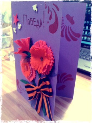 Наша с Сонечкой поделка-открытка на 9 мая-в детский садик. Нестандартная техника)))))гвоздики из фетра, бантик -георгиевская лента, Пайетки, пуговицы.... голуби, звездочка и наше хорошее настроение!)))