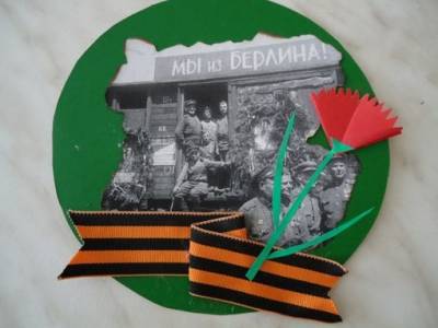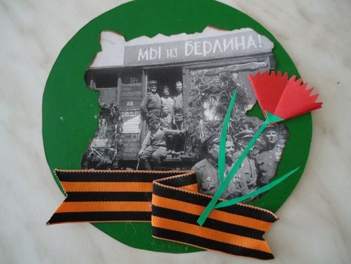 Для изготовления необходимо: цветной картон, цветная бумага, клей, ножницы, георгиевская ленточка, распечатанные на бумаге чёрно-белые военные фото. 1. Вырезаем фон открытки: круг - цвет любой, на выбор 2. Вырезаем фото и края её обжигаем, наклеиваем фото на круг 3. Из цветной бумаги делаем гвоздичку, сложив её треугольником и вырезаем лепестки, добавляем стебель и листочки. 4. Наклеиваем гвоздику и закрепляем всё георгиевской ленточкой. Открытка готова.