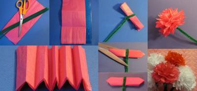 Приближается великий День Победы. Этот праздник так или иначе затрагивает каждого человека, ведь в Великую Отечественную войну не было, пожалуй, ни одной семьи, которую бы обошло бремя войны. Непосредственных участников и свидетелей тех лет с каждым годом становится все меньше и меньше. Не упустите возможность сказать спасибо тем, кто еще рядом с нами. Ну и конечно о подвигах ветеранов и историю Дня Победы нужно рассказывать маленькому поколению, которые смогут узнать о празднике, создавая тематические поделки вместе с вами. Как сделать гвоздику из гофрированной бумаги Какой же праздник обходится без цветов!? Своеобразным символом Дня Победы стала гвоздика, которую мы и попробуем научится сделать. Для этого понадобится гофрированная бумага, ножницы, синильная проволока. Для начала сделаем из подготовленной бумаги заготовки в виде одинаковых по размеру прямоугольников. Для создания цветка возьмем шесть прямоугольников, складываем их гармошкой и скрепляем посередине синельной проволокой. Затем заостряем края ножницами как это показано на рисунке. В завершении поднимаем каждый слой бумаги вверх и к середине, придавая цветку пышность. Для разнообразия можно сделать букет из различных цветов бумаги. Такими цветами можно украсить любой плакат, открытку или композицию подготовленную к празднику 9 Мая.