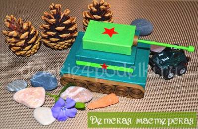Мы все очень гордимся нашими героями, людьми, которые отдали свою жизнь за светлое будущее для нас. Чтобы закрепить в памяти ребенка эту важную дату, можно вместе с ребенком сделать поделки на военную тему, попутно рассказывая о тяжелых военных днях. Лучшие поделки на военную тему — это конечно военная техника, вот и давайте сделаем вместе с ребенком модель танка. Для изготовления поделки своими руками понадобятся следующие материалы: три коробки разного размера; цветная бумага тёмно-зелёного и светло-зёленого цвета; клей ПВА-К; зубочистки; полоски для квиллинга зелёного и коричневого цвета; линейка и линейка с окружностями; простой карандаш; ножницы пятиконечные звёзды красного цвета. Приступаем к изготовлению танка. Берём три коробки разного размера. На темно-зелёном листе бумаги отмеряем линейкой и проводим простым карандашом линию так, чтобы полоска подходила по ширине к боковым сторонам коробки. Намазываем полоски клеем и оклеиваем боковые части коробки. Так же поступаем со средней коробкой. Вырезаем два прямоугольника для оклеивания верхней и нижней части коробки. Клеим прямоугольники на коробку. Для коробки среднего размера тоже вырезаем прямоугольники и приклеиваем на коробку. Для самой маленькой коробки используем светло-зелёную цветную бумагу. Вырезаем необходимые элементы для оклеивания. Когда все коробки оклеены бумагой, склеиваем их между собой клеем ПВА-К. Будем делать ствол для пушки танка из зубочистки и полосок для квиллинга. Смазываем зелёную полоску клеем и накручиваем её на зубочистку. На концы зубочистки наматываем зелёную полоску и конец смазываем клеем.Ствол для пушки практически готов. С одной стороны ствола наматываем коричневую полоску для того, чтобы пушку было удобно приклеить к самому танку. Клеим одинаковые светло-зелёные полоски с двух сторон средней коробки. Теперь будем делать гусеницу с шестью катками. Для этого нам нужно разрезать ножом острую часть зубочистки и вставить в неё коричневую полоску. Наматываем полоску полностью и аккуратно снимаем, придерживая пальцами. Помещаем её в окружность на линейке для того, чтобы все катки были одинакового размера. По шесть треков клеим на обе стороны танка.Готовим коричневую полоску, чтобы оклеить треки. Оклеиваем треки с двух сторон танка и готовим четыре красные звезды. Звезду большего размера клеим сверху, а три размером поменьше по бокам и спереди. Танк-победитель готов!