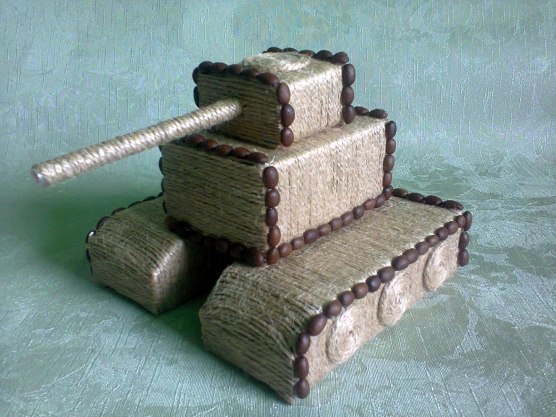 Мастер-класс. Объемная поделка к 9 Мая Для работы нам понадобится : - рулон шпагата; - 4 коробки (для корпуса, гусениц, башни; коробки могут быть любого размера, это будет зависеть от того, какой танк по размеру вы хотите) - трубочка для ствола танка; - клей; - ножницы; - кофейные зерна. 1. Берем коробку и вкруговую обматываем ее шпагатом, для того чтобы шпагат не съезжал, коробку в некоторых местах промазываем клеем. С торцов коробку обклеиваем полосками шпагата, торчащие концы шпагата обрезаем. 2. У нас получаются вот такие детали. 3. Когда все детали танка обмотали шпагатом, приступаем к его декорированию. Оформляем гусеницы, для этого вырезаем круги из картона, на всю поверхность наносим клей и по кругу, начиная от центра, приклеиваем шпагат. Кофейными зернами скрываем боковые швы после обрезания шпагата и зерна можно приклеить по кругу гусениц, для придания яркости поделки. 4. Вот такой танк получается. Если кто-то заинтересовался буду рада.