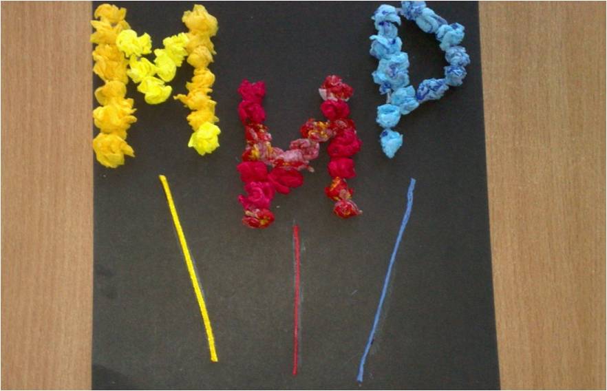 1.Салфетки разрезаем на маленькие квадратики, мнём их и скатываем в виде шариков. 2.На листе черного картона пишем белым восковым мелком слово «МИР». 3.Затем приклеиваем шарики определённого цвета по контуру букв. 4. Нарезаем нитки на кусочки длиной 4 и 7 см. Клеем – карандаш намечаем линии «салютных выстрелов» и приклеиваем по ним нитки, соответствующие цвету «огоньков» салюта. 5.Вот наш праздничный салют и готов! С праздником Великой Победы!