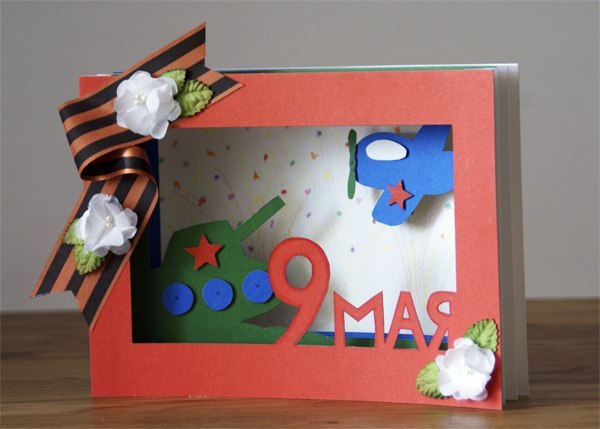 Нам понадобится: - разноцветные листы картона; - белая крепированная бумага; - цветная бумага (желтого и зеленого цветов); - акварельная бумага; - клей-карандаш; - Георгиевская лента; - макетный нож. Сначала мы нарисовали набросок будущей открытки. Мы решили, что открытка будет формата А5 поэтому согнули пополам листы офисной бумаги и нарисовали на них шаблоны каждого слоя открытки. Аккуратно острым макетным ножом вырезаем контуры. Острым карандашом обводим шаблоны слоев на картон. И снова обрезаем лишнее. Из листа акварельной бумаги вырезаем прямоугольник такого же формата. Дополняем небольшими деталями слои открытки. Приклеиваем их на вспененный скотч, так они будут смотреться объемнее. На листе акварельной бумаги рисуем салют. Первый слой открытки мы решили украсить цветами яблони. Для этого из крепированной бумаги белого цвета вырезаем небольшие круги, по три круга для каждого цветка. Складываем круг сначала пополам, затем на треть оставшейся части и еще раз на треть (как показано на рисунке). Край лепестка обрезаем в форме капли. Разворачиваем, получаем 6ти лепестковый цветок. Обрезаем один лепесток, рядом делаем надрез и подклеиваем к нему соседний лепесток, получается конусообразный цветок. Вырезаем небольшие круги из акварельной бумаги и приклеиваем к ним цветочки - спинка к спинке. У нас есть готовые тычинки, поэтому в центре цветка делаем небольшое отверстие и продеваем в него тычинки. Можно вырезать небольшой прямоугольник из желтой бумаги, сделать частые, неглубокие надрезы и приклеить в центр. Листья можно вырезать из зеленой бумаги и приклеить к обратной стороне цветка. У нас готовые листочки на проволоке, поэтому мы обматываем тычинки проволокой и отрезаем излишки. Вот такие цветочки у нас получились. Из акварельной бумаги вырезаем прямоугольник, его высота должна быть равна высоте открытки, а ширина - 10,5 см. Через каждые 1,5 см проводим линию и сгибаем прямоугольник гармошкой. Начинаем собирать открытку - приклеиваем фоновую часть из акварельной бумаги к самой нижней части гармошки. До этого на обратной стороне можно написать поздравление. Приклеиваем последующие слои. Пока клей высыхает, украшаем переднюю часть открытки - приклеиваем Георгиевскую ленту и цветочки. Наклеиваем последний слой открытки. Открытка готова!