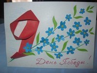 Нам потребуется: заготовка под открытку или лист белого картона; цветная бумага красного, голубого и зеленого цветов; бисер желтого цвета; зеленые нитки для вышивания; клей ПВА; красная ручка или фломастер; ножницы. 1.Берем лист картона, сгибаем его пополам. Для этого по линии сгиба проводим ножницами. Переворачиваем лист горизонтально, именно так мы будем работать дальше. 2. Если у вас есть двусторонняя красная цветная бумага, то просто отрезаете от нее полоску вдоль листа шириной 2 см. Если же бумага окрашена только с одной стороны – сгибаем лист вдвое, склеиваем и получаем полоску, красную с двух сторон. 3. Далее, с помощью ножниц, закручиваем полоску с двух сторон.. Потом загибаем снизу наискосок, делая «крючок» девятки. 4. Размещаем полоску на будущей открытке под углом, приклеиваем только прямую линию, нижний загиб оставляем свободным, как и часть полосы сверху – из нее будем формировать «круг» нашей цифры 9. 5. Теперь делаем девятку. Загибаем верхнюю часть полоски, при необходимости – лишнее отрезаем, делаем отметку карандашом и клеим 6. Готовим цветочки, рисуем их на синей или голубой бумаге, на тыльной стороне. Цветочки можно делать произвольной формы и желательно – разного размера. Вырезаем. Понадобится около 20-ти цветочков. 7. На зеленой бумаге рисуем листики. Несколько – маленьких, для завершения ветки, остальные – побольше. Количество – на ваше усмотрение. 8. Готовим веточки. Их делаем с помощью ниток для вышивания. Предварительно карандашом намечаем их месторасположение на открытке. Для удобства используем иголку, нитки – полностью намазываем клеем ПВА. Веточки для нашей открытки готовы. Следы от клея станут незаметными после того, как клей полностью высохнет. 9. Теперь размещаем цветы на открытке к 9 мая. Сначала составляем композицию, потом приклеиваем их клеем за серединку, для создания объема. 10. Размещаем и приклеиваем листочки. 11. С помощью крупного желтого бисера – делаем цветочкам серединки. Бусины отлично держатся на обычном ПВА, надо только дать клею хорошенько высохнуть. 12. Теперь пишем красной серебристой ручкой или же красным фломастером на нашей открытке к 9 мая: «День Победы» или «Поздравляем», или любую другую надпись на свое усмотрение. ![]()